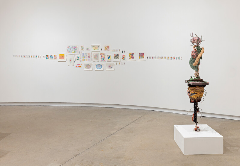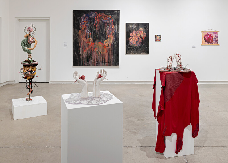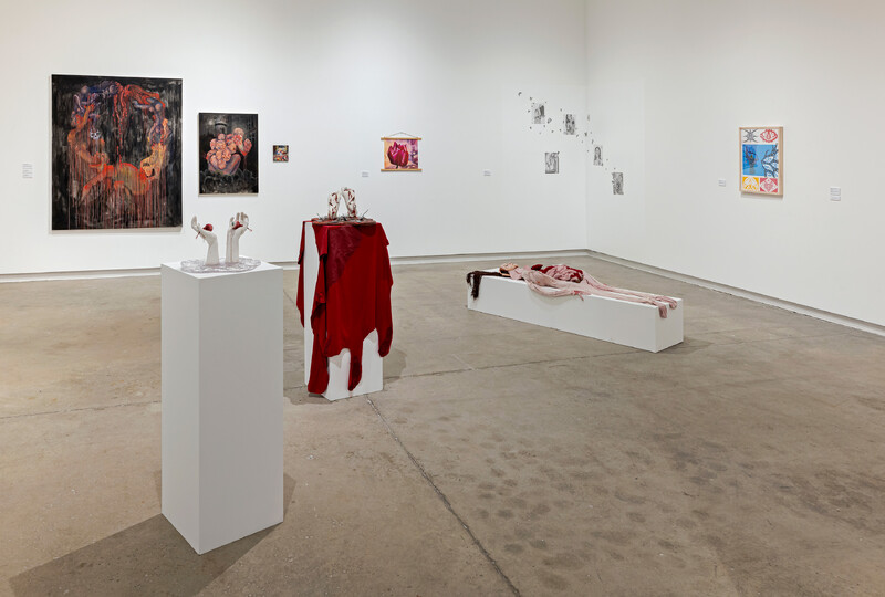 At the centre of the space, sculptures reveal personal reflections on the body. Morgan McCracken and Emma Tanner expose the persistence and strength of physical and emotional pain. While Seline Rajkumar’s work embodies themes of love, creating a safe space for artists and audiences alike. Acceptance of one’s true self restores power to our experiences, something Meihan (Erin) Yang channels through printmaking.