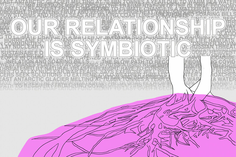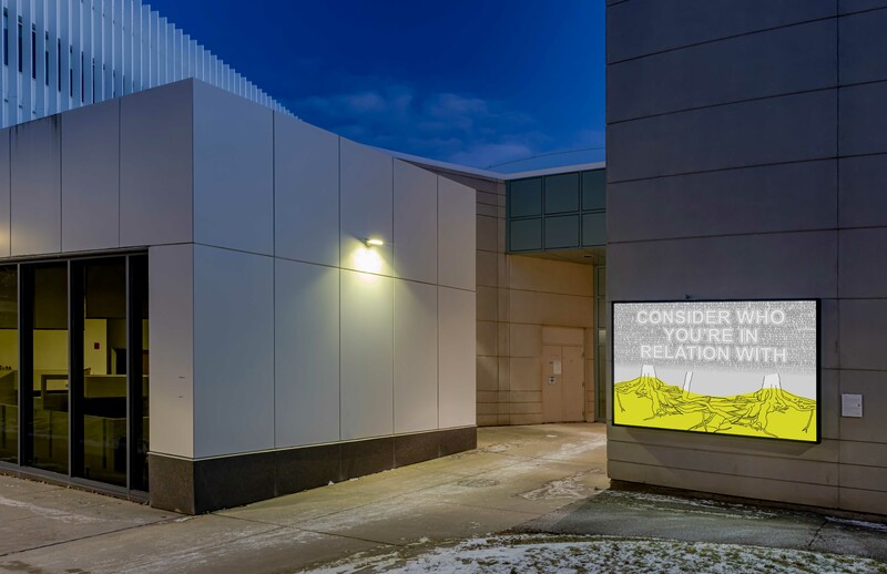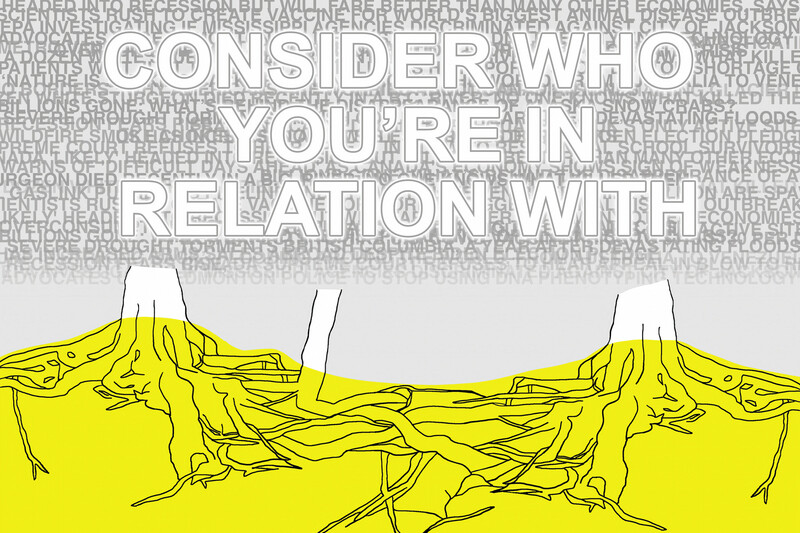 Across the series, Battle offers prompts that seed the impulse to regain a sense of agency against fatalistic attitudes: “FOLLOW THE THREADS OF THE NETWORK,” “ATTUNE TO HOW INFORMATION TRAVELS,” “CONSIDER WHO YOU ARE IN RELATION WITH,” “OUR RELATIONSHIP IS SYMBIOTIC.” With each statement, Battle cuts through the noise of the news with strategies of empathy and criticality that foster collective resilience and action. The analogies between the natural and more-than-human world, urge viewers to recognize social and ecological relationships. These statements are not intended to be a utopian antidote, but rather achievable and persistent empowerments.