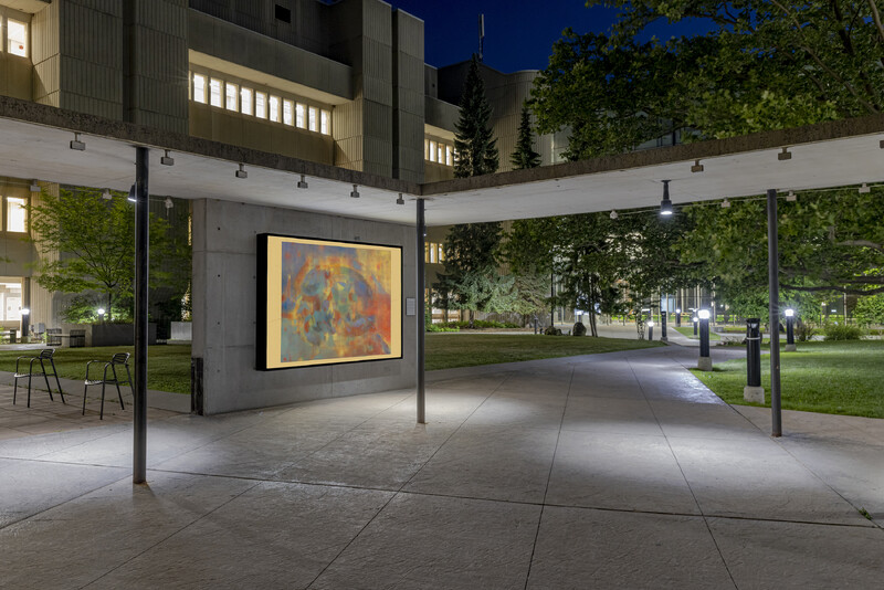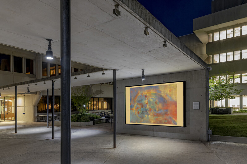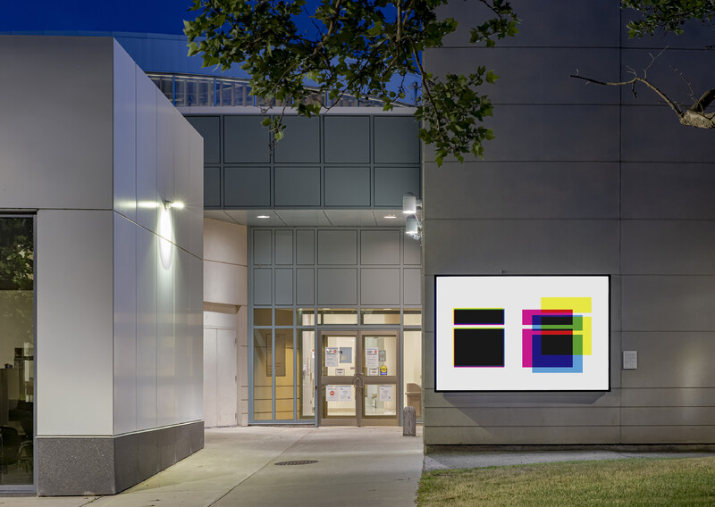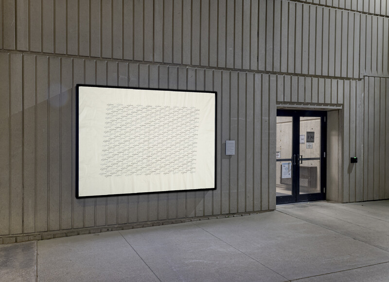 Centering the ornament in this series is to revitalize it as a field of artistic and cultural practice, while expanding its forms of communication. Each lightbox offers different ways of reading the ornament. They include geometric, architectural, painterly, and textual references that represent different artistic ways of ornamentation. Hamra Abbas’s Kaaba Picture as a Misprint depicts a geometric distortion of the most sacred site of Islam, a site of both pilgrimage and nostalgic return. Architectural forms in the work of Ayesha Singh attain more readability: iconic motifs of Mughal structures in India are recognizable despite their hybridized and amalgamated forms. Azadeh Elmizadeh’s work is situated between abstraction and representation in that it obscures figures in a battle scene, commonly depicted in the Shahnameh of Shah Tahmasp. The figures and their actions retain their relational energy in the heat of battle, even as they are effaced and made esoteric through painterly ornamentation. Finally, Golnar Adili’s Bestizand (They Quarrel) evokes binaries—of decoration and function, translation and opacity, textual and visual—that further explodes the ornament into the realm of possibility through articulation and refusal.