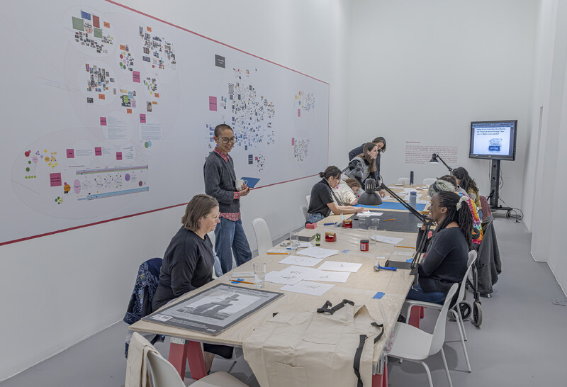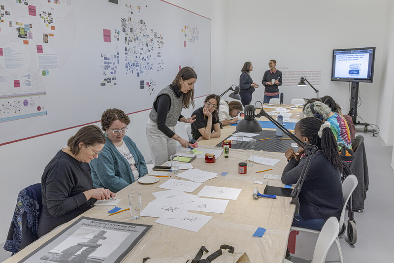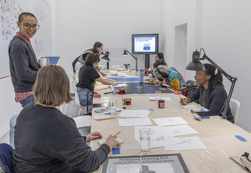 STIM CINEMA (2024) embraces the stim as a form of care. In considering the tendency towards repetitive gestures, which are deeply comforting to neurodivergent folks, I’ve come to adore linocut printing as an expressive way to stim. I find the repetitive printing process akin to a self-soothing form of care, given how it foregrounds sensorial elements—specifically those pertaining to visuality and tactility. When I teach at the Art Gallery of Ontario, my courses often incorporate linocut as a bridge to mixed-media forms. Lino block printing is a practice that students often lose themselves in—be it in the designing, carving, or printing steps of the process. To read alongside the ethos of The Neurocultures Collective, we’ll spend lunchtime collaboratively carving and printing designs based on the installation while we find inspiration for our expressive stimming in the e|gallery.