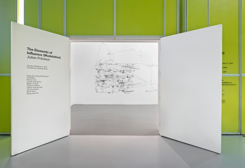 The Elements of Influence (Modulation) (2017) translates these four works by tracking the eye-movements of viewers and reproducing them in wool on the walls of the e|gallery as an echo or ghostly trace. The exhibition in the Blackwood is therefore also visible in the e|gallery as a translation or transformation made by the vision of the local community at the University of Toronto Mississauga.
