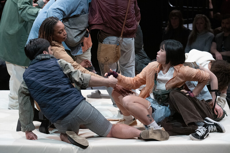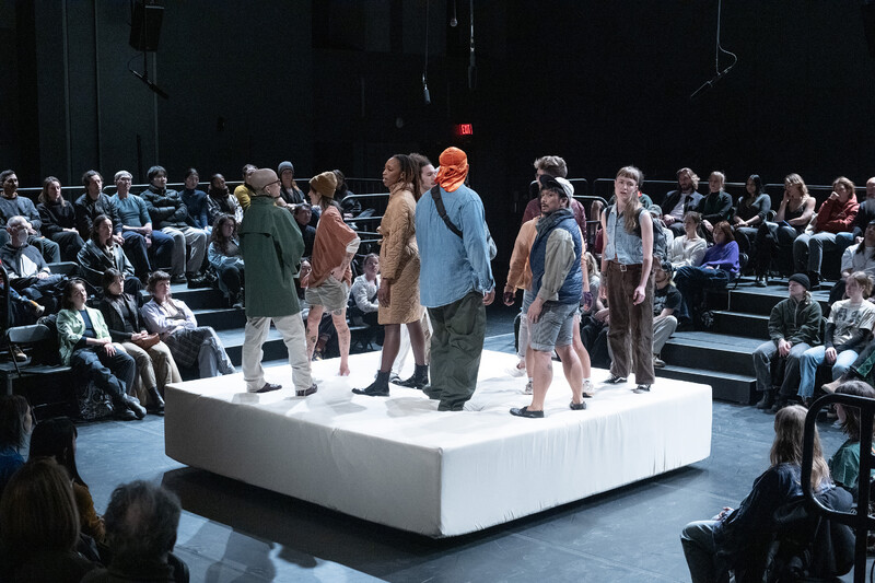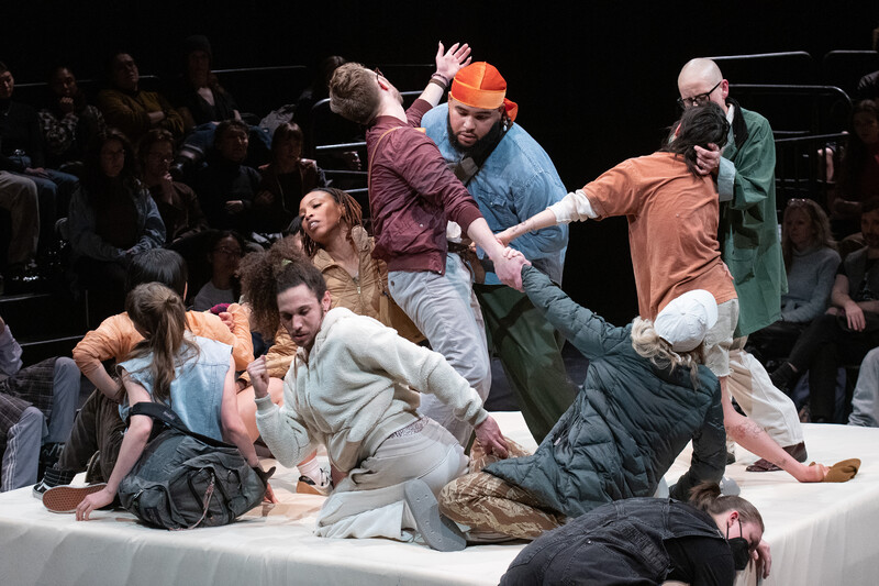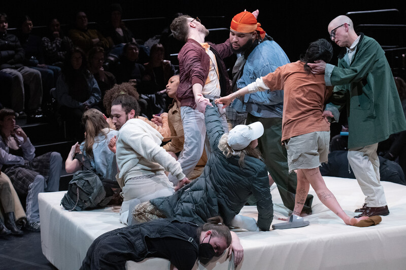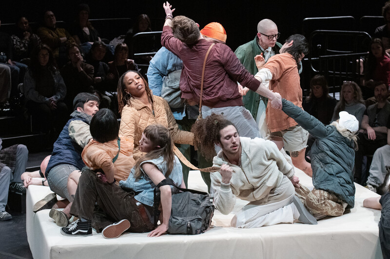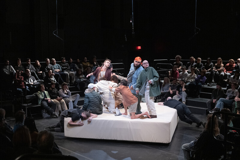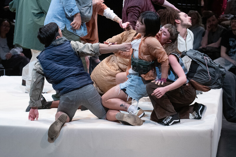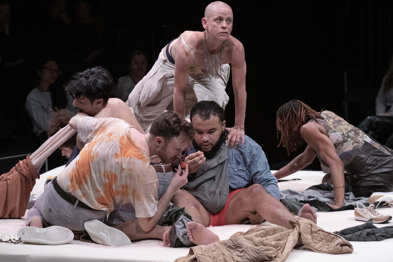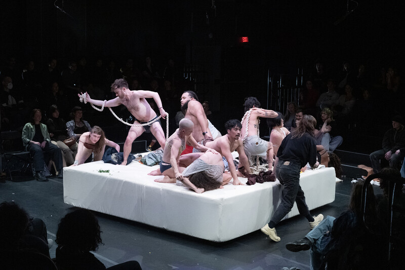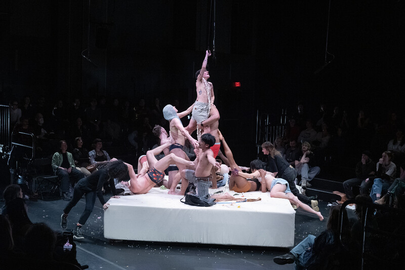 Weathering is a multi-sensory performance, conceived by Driscoll as a moving human sculpture made of bodies, sounds, scents, liquids, and objects. Ten performers perpetually enact a morphing “tableau vivant” on a mobile raft-like stage. Their life raft surges and spins through crisis and alienation, with their voices generating a score that crescendos and resonates as they clutch, careen, and cleave on a platform too small to contain them. The audience embanks the performers, close enough to smell the sweat and feel the steam of the scenes unfolding before them. Weathering enacts conflict, eroticism, and care arising from a messy and mutable collectivity.