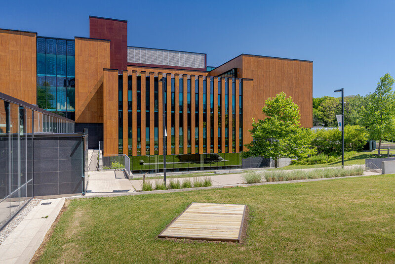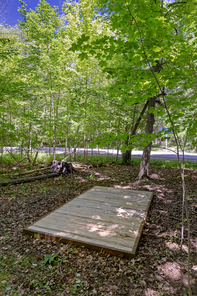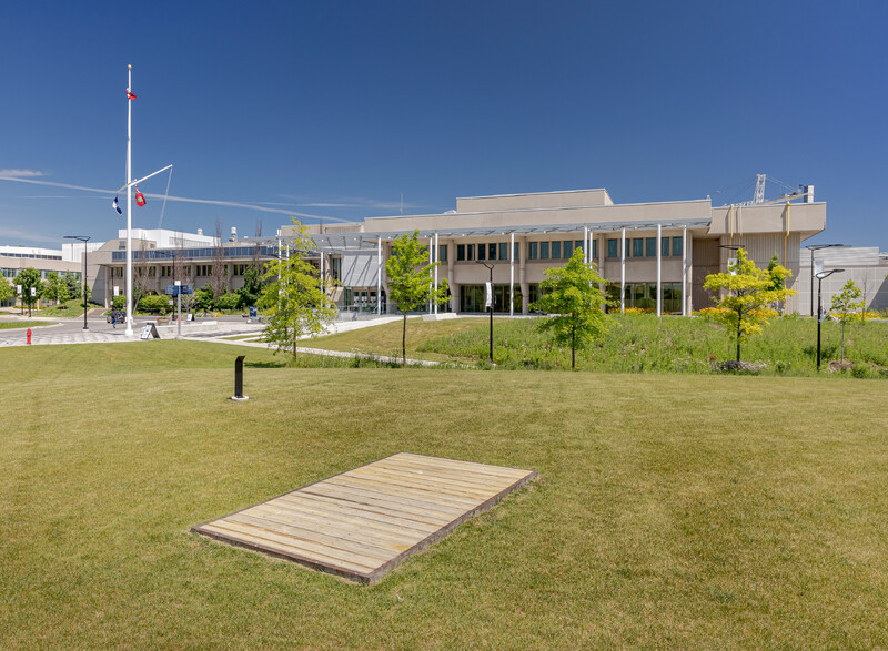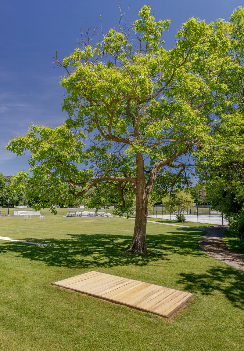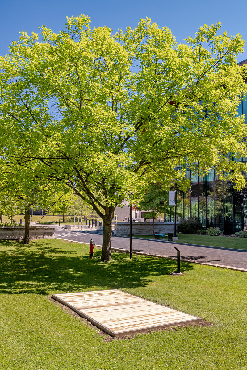 Agamiing […] consists of seven platforms built from old-growth lumber and copper, which are each installed in distinct sites across the campus. Materially, the platforms’ copper detailing is symbolically rich: it recalls early mineral extraction in the Great Lakes region, and references the sacred use of copper for holding and carrying water in many Indigenous communities. Rematriating copper and old-growth wood harvested from Lake Ontario back to the land, Miner’s work also explores the non-linear temporal concept of aanikoobijigan (ancestors/descendants), serving to bring past, present, and future into dialogue with one another.