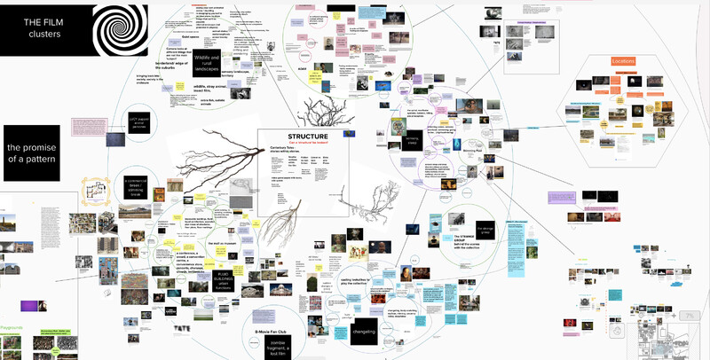 Lastly, at the far end of the gallery, is the pairing of the “First Mural” and “Second Mural.” These murals work in concert to establish senses and sensibilities that collectively steer the direction and creation of the film. The lattice of nodes form what look to be an elemental structure, where each node contributes to a larger composite. A few of many terms mixed together include puppets, sci-fi, horror, sensory ethnography, creatureliness, and gestures.