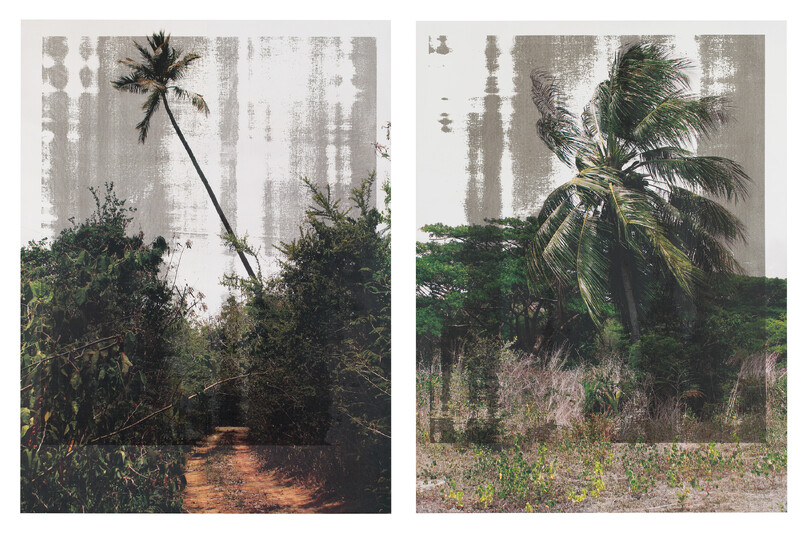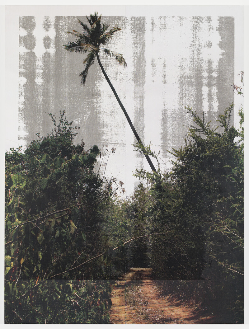 Contracts reproduces images of these sites using a screen-printing method in which ink is forced through a woven mesh that has some areas blocked by an impermeable substance. The resulting image is created in the areas where the ink passes through the screen and penetrates the canvas below. However, on top of the resulting representational image are overlaid multiple layers of black ink. What would normally be considered the final image of a beautiful tropical destination is thus exposed to additional passes of ink that cover it either entirely or partly. A counterpoint to the landscape’s apparent vitality, the final images depict a dividing, breaking, and partitioning of idyllic harmony.