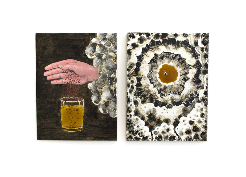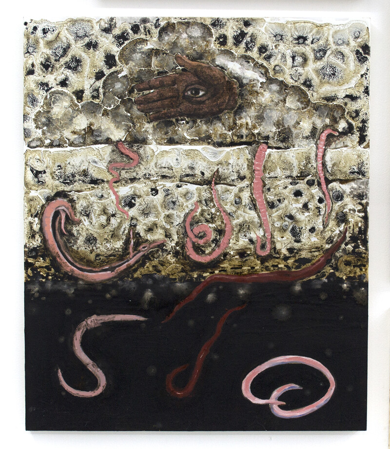 Amidst these musings, the artwork also questions the contemporary pursuit of sacred art and the role of human agency in transforming matter. Referencing ancient emblems and alchemical illustrations in her paintings, Roy appropriates the motif of the “hand of God” as a stand-in for the human hand, playing God, fixated with building apparatuses of extraction. This human desire to devour and consume is set against the backdrop of capital accumulation, which Roy argues, has obscured the sacred in our lives. In the face of “looming extinction,” the artwork prompts viewers to consider new directions and purpose.