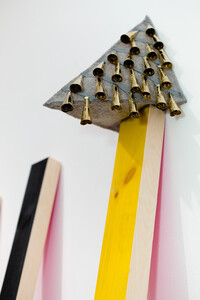 East Wind Brings a New Day: Revisited (2015), a supergraphic wallwork and installation by Brooklyn-based artist Maria Hupfield, juxtaposes images of the Ontario landscape with sculptural elements that reflect Anishinaabe culture. The central element in the installation is a shower curtain upon which Hupfield has cheekily painted a version of ‘Group of Seven’ progenitor Tom Thomson’s iconic early 20th-century West Wind in the ‘Indian Group of Seven’ member Norval Morrisseau’s equally iconic 1970s Woodlands style. Thomson’s curvilinear Art Nouveau stylization melds seamlessly with Morrisseau’s biomorphism. Seeing a version of the Georgian Bay’s storm-battered West Wind pines transplanted into a setting of domestic décor (and personal hygiene) is bracing, and humourously mirrored by the smudged drawing of a Thunderbird on the wall above from which a lit pink light bulb hangs on a red electrical cord. Further along, four pine two-by-four studs lean against the wall; the back of studs are painted fluorescent pink which reflects onto the wall; each individual stud is painted in one or the colours of the four directions—red, yellow, black, white—echoing the perpendicular supergraphic rendering of water and sky on the adjacent wall.