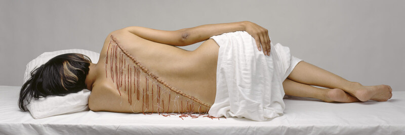 The deep scar traversing the figure's back was created using special-effects makeup. What appear to be thin rivulets of blood running from the gash are composed of small red beads, a detail that evokes both Belmore's heritage and the material violence enacted upon the bodies of Indigenous women, which includes but is not restricted to the ongoing epidemic of domestic violence as well as missing and murdered Indigenous women in twenty first-century Canada. Despite the gravity of the represented woman's injury, Belmore's Fringe is also about healing. Of this work, Belmore states, “As an Indigenous woman, my female body speaks for itself. Some people interpret the image of this reclining figure as a cadaver. However, to me it is a wound that is on the mend. It wasn’t self-inflicted, but nonetheless, it is bearable. She can sustain it. So it is a very simple scenario: she will get up and go on, but she will carry that mark with her. She will turn her back on the atrocities inflicted upon her body and find resilience in the future. The Indigenous female body is the politicized body, the historical body. It’s the body that doesn’t disappear” (Rebecca Belmore in conversation with Kathleen Ritter, Vancouver Art Gallery, 2008).