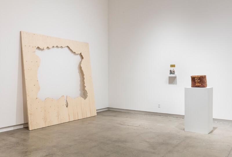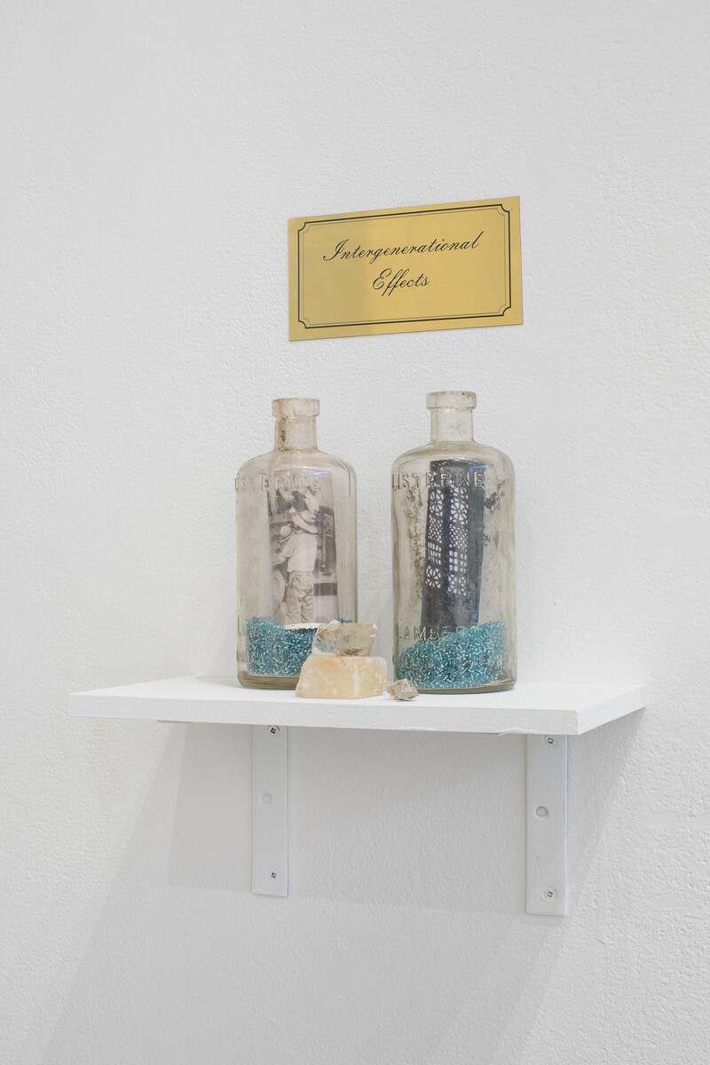 The objects here, found on the artist’s reserve, reference dark histories of substance use and the self-medicating work of communities addressing trauma in the wake of the residential school system and colonial experiences of Settler occupation. In the bottles, amongst loose beads the colour of mouthwash, partially obscured images show children in the back of pickup trucks on their way to residential school, and an image of the selenite windows in the Basilica of Saint Sabina, a historical church in Rome, Italy.