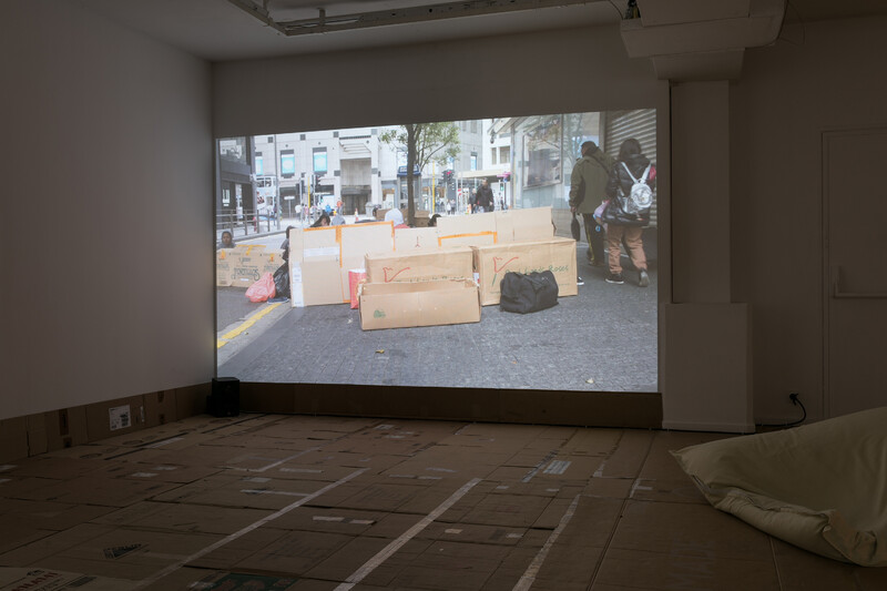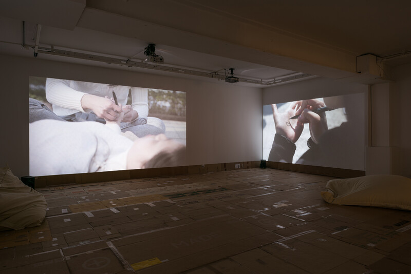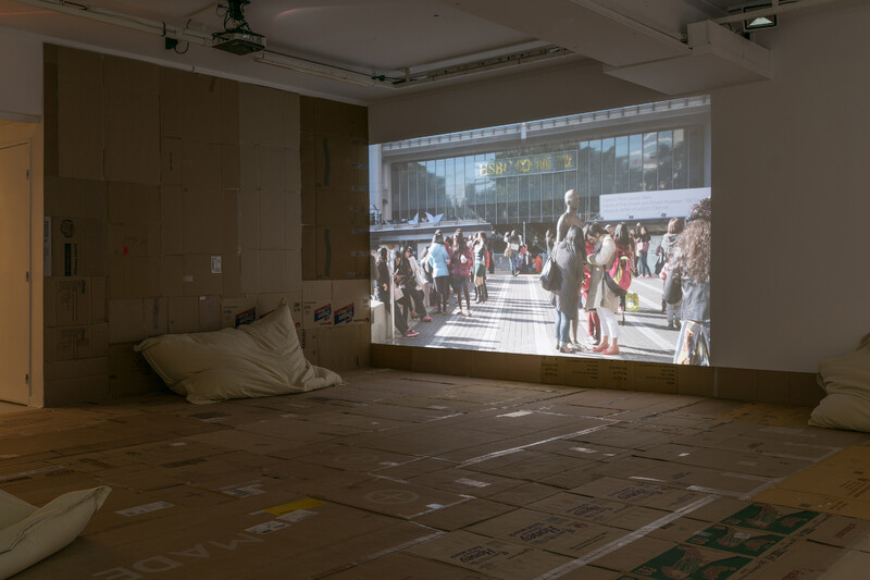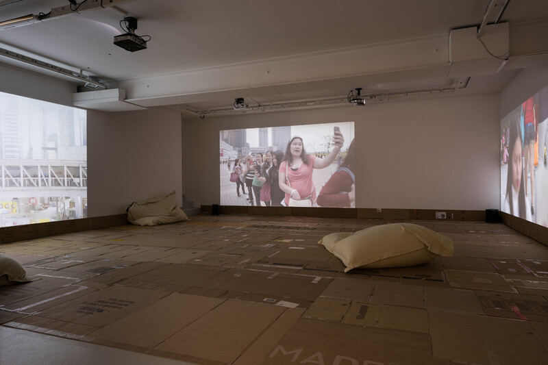 Stephanie Comilang’s science fiction documentary Lumapit Sa Akin, Paraiso (Come to Me Paradise) uses the backdrop of Hong Kong and the various ways in which Filipina migrant workers occupy its downtown Central district. The film is narrated from the perspective of Paraiso, a disembodied ghostly drone who speaks of the isolation from being uprooted and thrown into a new place and whose purpose is to transmit the women’s vlogs, photos, and messages back home. On Sundays, Central becomes a pivotal place for Paraiso and the three protagonists as thousands of these workers congregate to create a space of care-giving, away from their employers’ homes where they live and work full time. From early morning to night, the women occupy and transform sites normally used for finance and banking into temporary care-giving spaces where they relax over food, drinks, manicures, prayer, and dance. Only when the women gather en masse is the signal strong enough to summon Paraiso to them for download.