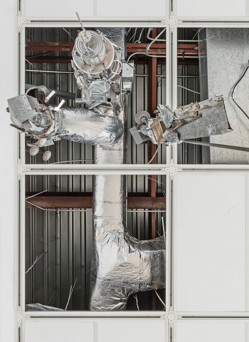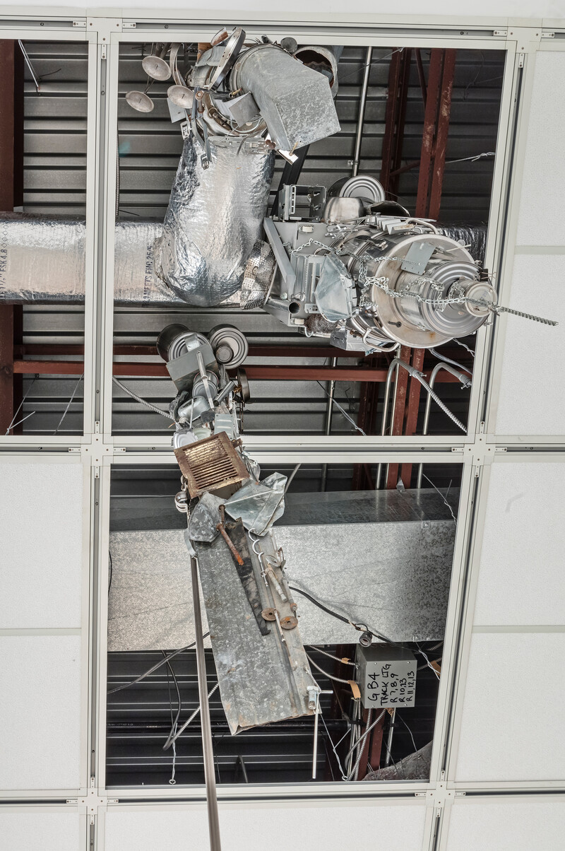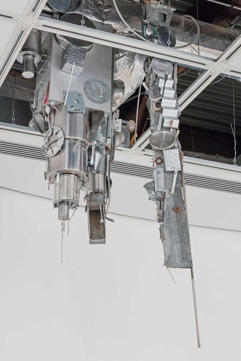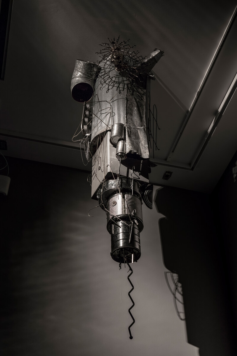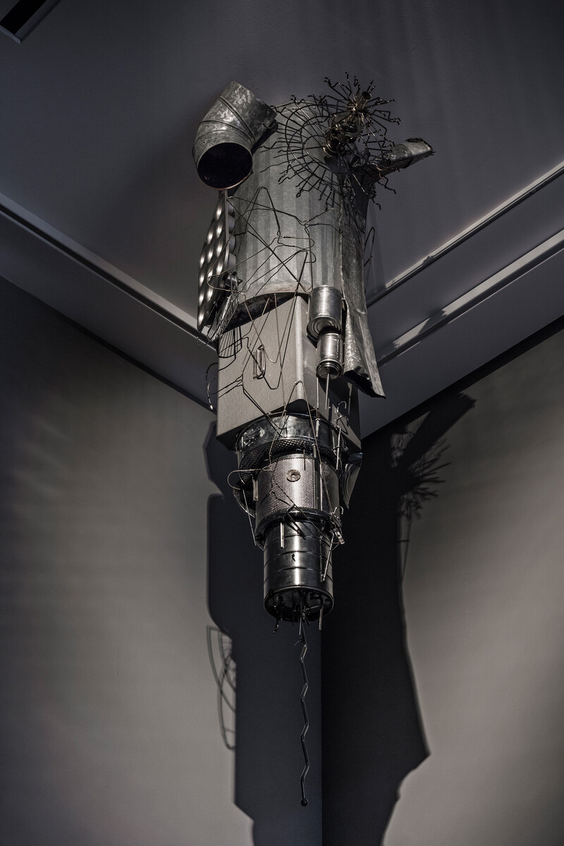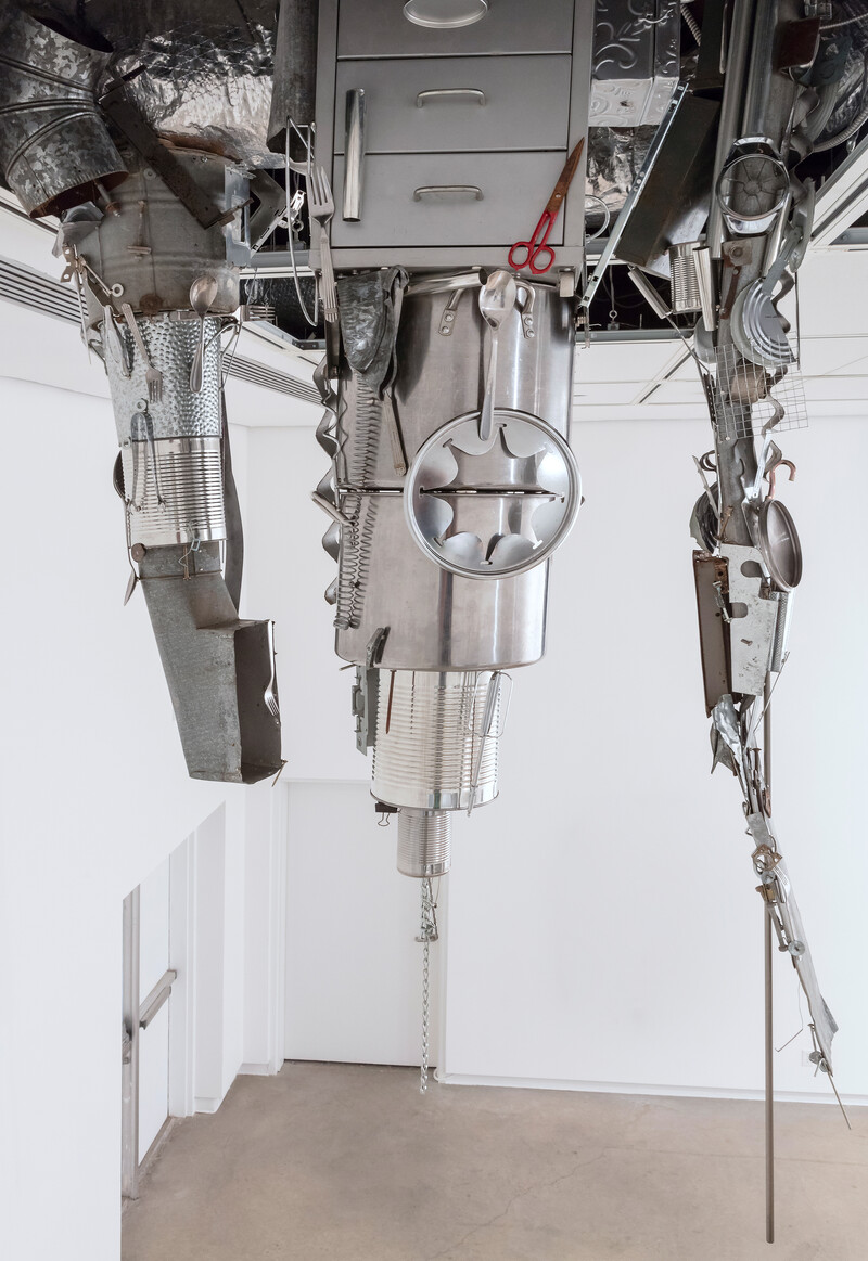 Uzelman’s The Cavorist Projects takes as its starting point eccentric scientist Joseph Cavor, a character from H.G. Wells’ 1901 novel The First Men on the Moon, who developed an anti-gravitational material he named “Cavorite.” Magnetic Stalactites (from The Cavorist Projects) are pendulous sculptures consisting of a collection of random metal detritus (tin cans, beer bottle caps, spoons, scissors, baking pans) that hang swarm-like from the gallery ceiling with great energy and leaps of the imagination. Magnetism emancipated from gravitational principles is harnessed as sculptural force; it shapes not only the narrative as a whole, but also, literally, the objects themselves.