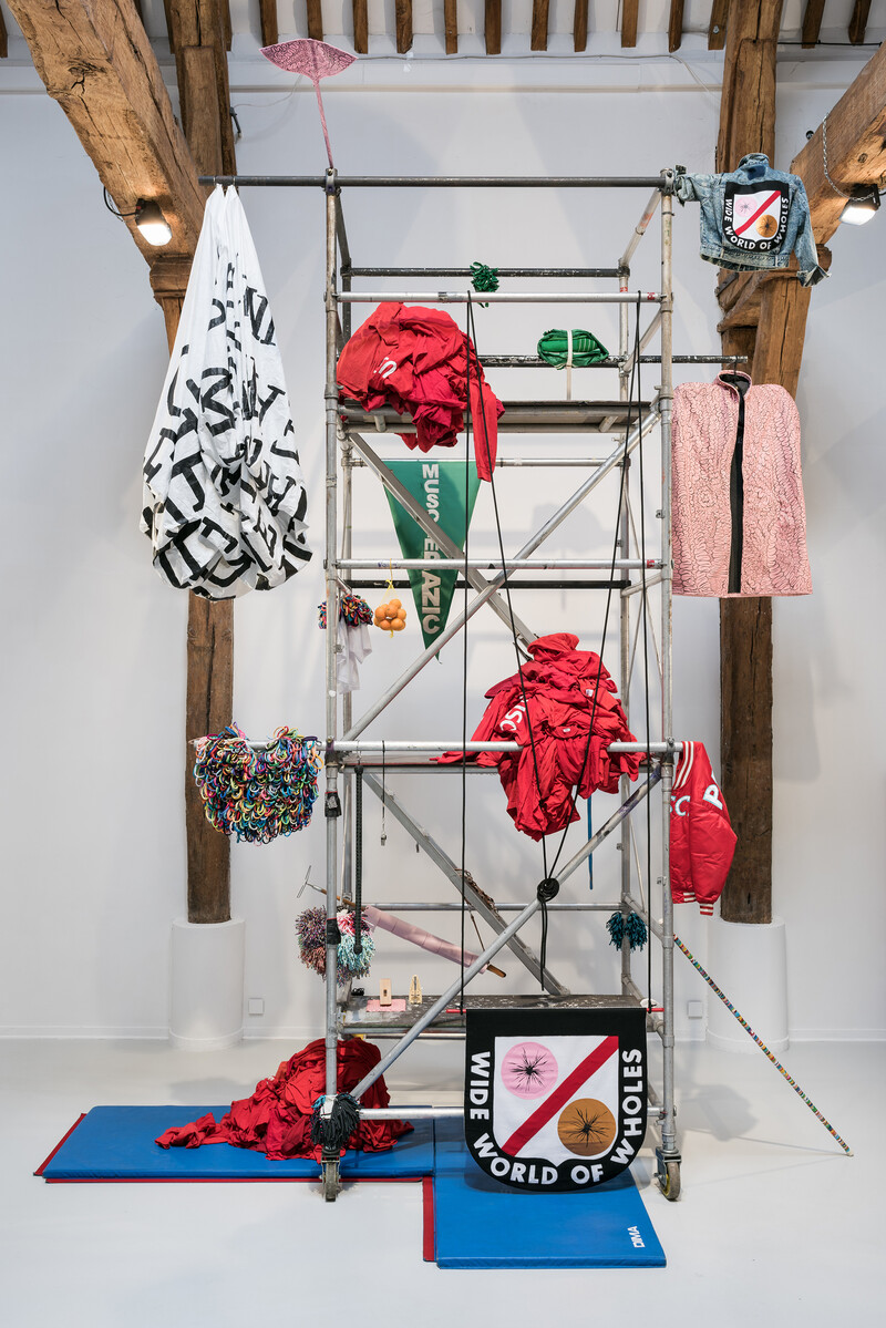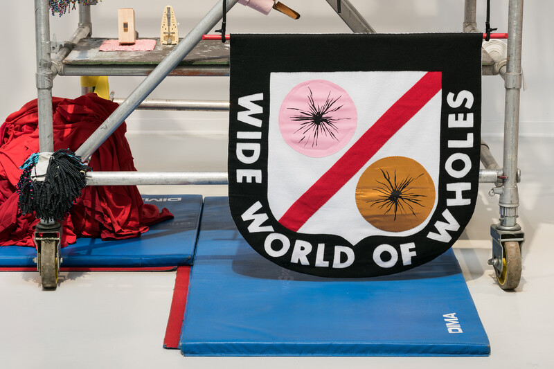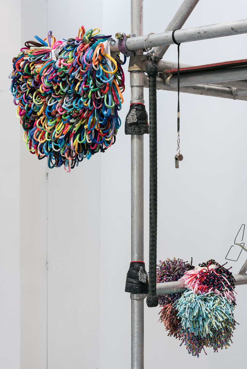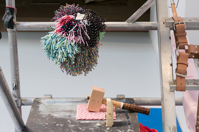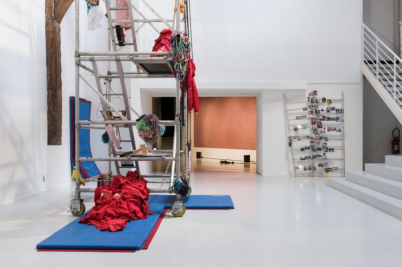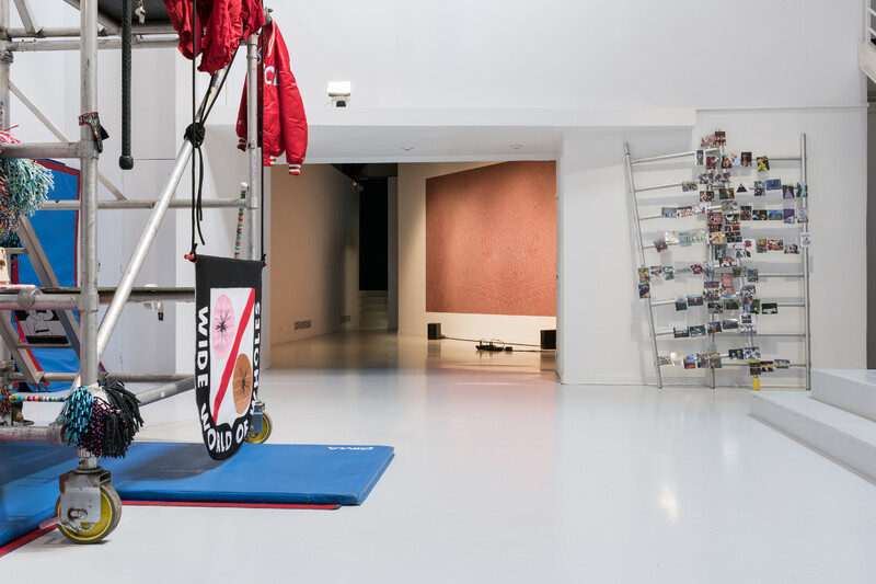 Hazel Meyer’s Muscle Panic (2015–ongoing) is an iterative world-making installation and performance project that uses various athletics tropes to enliven and re-centre the importance of desire, queerness, movement, and sweat. Muscle Panic engages non-professional LGBTQ+ performers within a scaffold installation containing objects that function across the spectrum of prop, tool, costume, equipment, and sculpture. Located between choreography and improvisation, Muscle Panic celebrates the idiosyncratic physicality of each performer, valuing spirit over virtuosity. Named after the sociological term ‘moral panic’ that describes an often irrational fear or threat to the dominant order, Muscle Panic creates a time and place beholden to a sweaty self-governance. It values and celebrates forms of gendered embodiment that threaten norms, and provides tools and physical prompts to highlight the situations in which we make and flex this power. Muscle Panic asks how we can use the tools in already existing structures to make a world that can hold us in ways it hasn’t before.