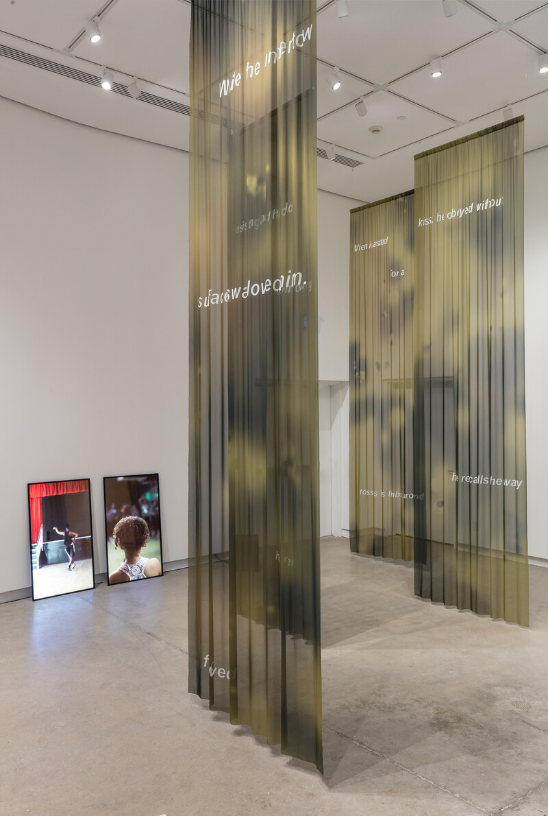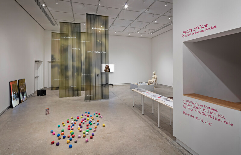 Paul Maheke’s work evokes the political dimensions of self and collective care, fragility, and sustenance. As Habits of Care curator Helena Reckitt explains, “the video diptych in Mutual Survival, Lorde’s Manifesto (2015) juxtaposes two forms of dance, both filmed in the same East London community centre. One, a compelling choreography by the dancer Jamila Johnson Small; the other, a less polished rehearsal by young members of a dance troupe in the run-up to the Notting Hill Carnival. Presenting dance as an activity of individual and collective becoming, Maheke’s handheld camerawork is intimate and embodied, as if at pains to avoid a voyeuristic view of these young black performers. As the title suggests, the piece also pays homage to the late black feminist writer Audre Lorde. In subtitles drawn from Lorde’s writings, selfcare is described as a practice of decolonization and feminist emancipation. A subwoofer placed on the floor across from the flat-screen monitors resonates in the visitor’s own body.”