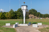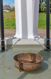 The Observatory for Riparian Repose is a story told in wind and water. Inspired by ancient bâdgir (windcatcher) designs of Iran, this immersive sculpture funnels ambient breeze into a strong directional wind that encounters a pool of liquid beneath the structure. Originally, bâdgirs served as passive cooling systems in hot desert climates, directing atmospheric winds into subterranean cisterns en route to domestic interiors. Observatory for Riparian Repose adapts the form of the bâdgir, detached from its intended function, with the aim of creating an environment for contemplating the enmeshing of elements. Through sculptural and textual additions, a story implicates this bâdgir within a broader narrative that ties together histories of extraction, collective madness, tellurian toxification, and the invention of solar time.