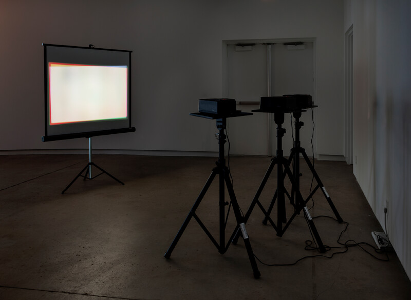 Aryen Hoekstra’s Out of Focus (RGB) ironically both refutes and confirms the title of the exhibition (Red, Green, Blue ≠ White). Three slide projectors devoid of slides beam light through a coloured filter whilst continuously auto-focusing. The red, green, and blue beams are positioned to converge into a rectangular field—a white or ‘non-image’ is thus created that represents the absence of colour. Upon further reflection however, one notices that the three beams result in a field of impure white; a not quite white. When a viewer intercepts the projection throw, incidental colours are created because in instances when two primary colour sources overlap coloured silhouettes of yellow, red, green, pink, etc. appear which mark the body of the interceptor. In this gesture, the body acts similar to a prism—when the white light meets the body, a multitude of coloured refractions result.
