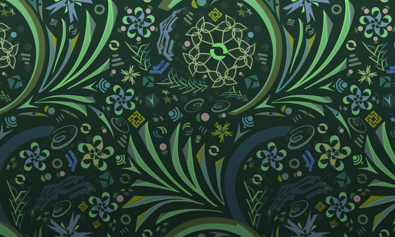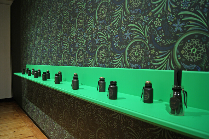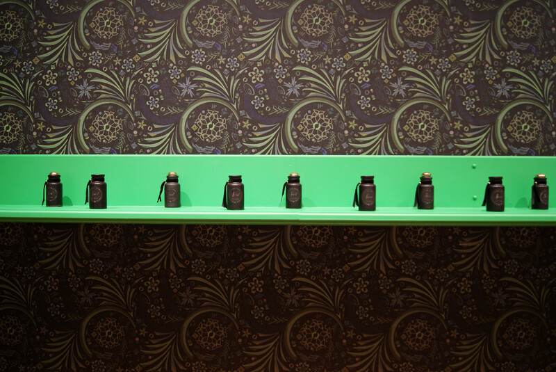 Offering further conceptual context for the project and situated behind the olfactory installation is Patterns of Indulgence, a wallpaper work composed of the logos of the twenty-five most powerful and contested Canadian Mining corporations operating in the Americas between 2018-2021.