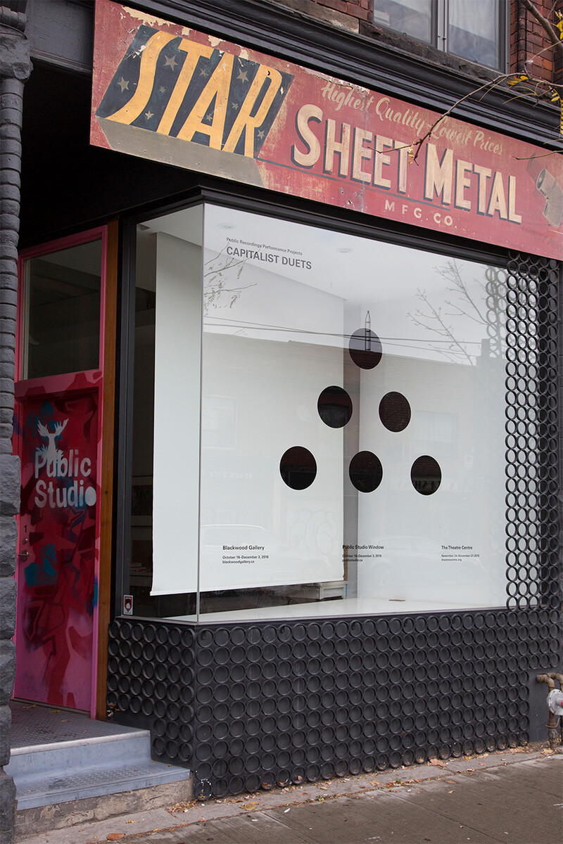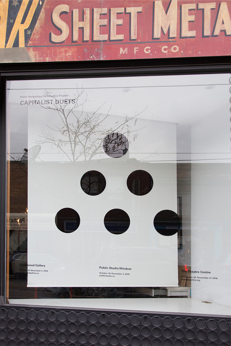 CAPITALIST DUETS is a performance made up of seven independently authored duets presented simultaneously as an unaffected spectacle. The 2016 iteration was presented at The Theatre Centre as part of the Blackwood’s 2016 exhibition I stood before the source. The performance tackled alternate ways in which we visualize and understand the economy and the flow of money and labour through choreography, communicating a more affective experience of capitalism located in the body and its movements. In order to disrupt the hierarchical commodification of contemporary performance, fourteen artists were paired, with each pair receiving the same microgrant for the time, props, travel, costume, and other expenses related to their duet. In their curatorial statement, Letters and Handshakes—a collaboration between Greig de Peuter and Christine Shaw—noted the significance in the absence of composers, architects, or any authority figures, describing CAPITALIST DUETS as a “free-market dramaturgy.” This transparency ensures that “the hidden labour of production becomes startlingly visible, and the visible, in turn, becomes practice. From dancer to choreographer, theatre technician, and art-presenting partner, everyone involved in CAPITALIST DUETS holds the status of performer, and every performer danced according to the same rules.”