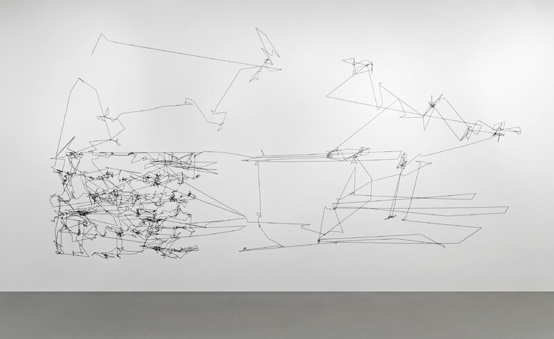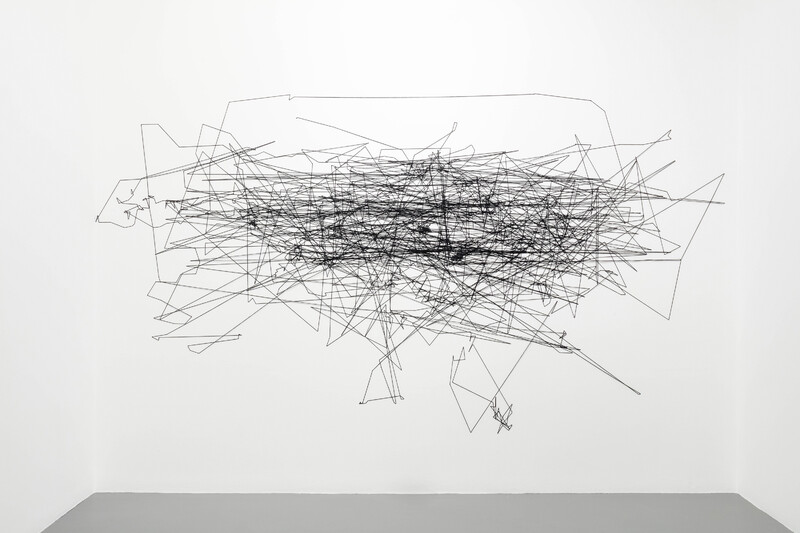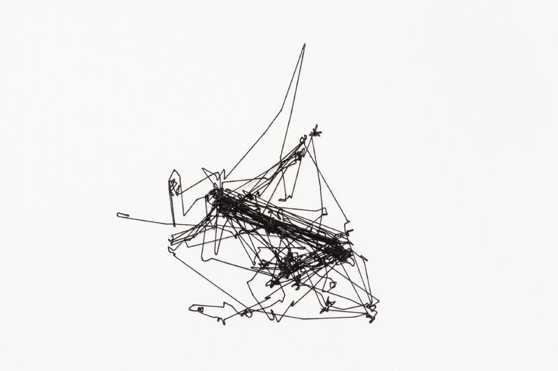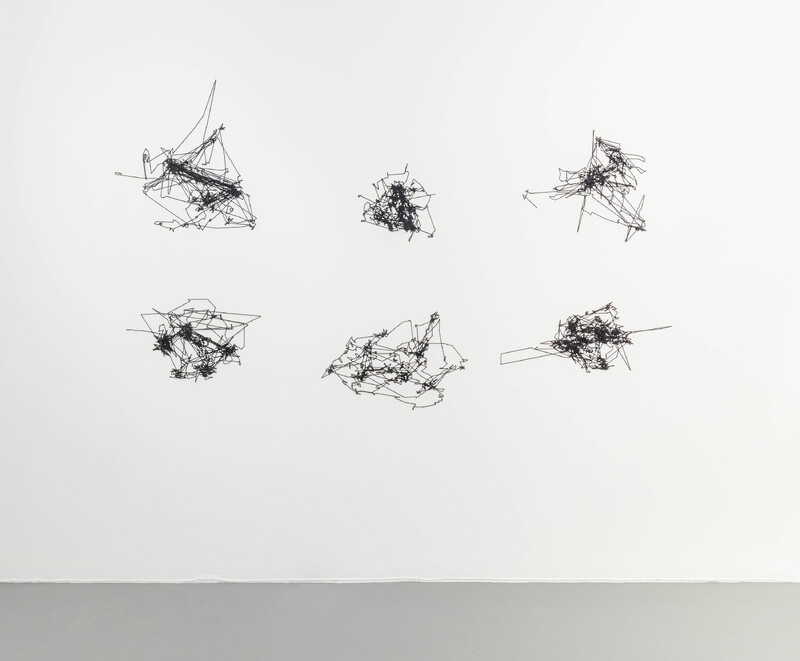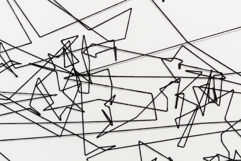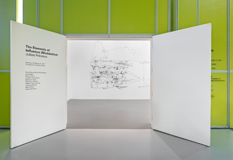 In preparation for his exhibition at the Blackwood Gallery, Prévieux organized a workshop with a group of students, staff, faculty, researchers, campus police, and employees of the administration at the University of Toronto Mississauga. Using an infrared camera, he recorded the movements of participants' pupils while they were looking at his work in the Blackwood Gallery. Eye-tracking software was then used to produce diagrams that visualize the eye movements across the exhibition, with the final sketches reproduced in wool on the walls of the e|gallery. The original exhibition is therefore also visible in the e|gallery in the form of cryptic lines and a ghostly imprint—a translation or transformation of the exhibition made by the vision of the local community at the University.