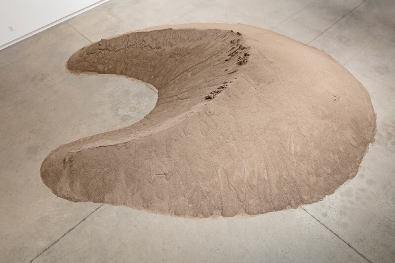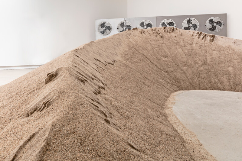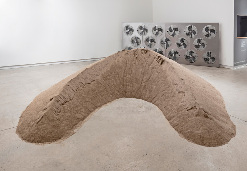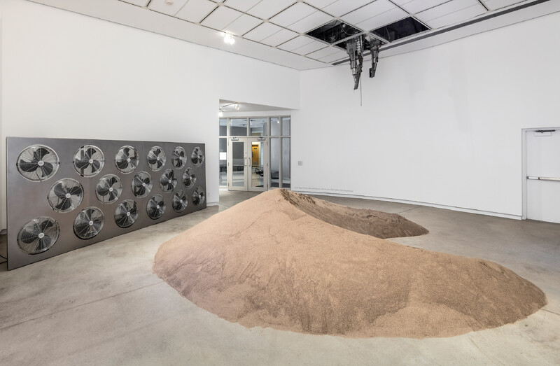 Robert Wysocki’s "site-specific" installation suggests desert physiography: dunes, mesas, buttes, mushroom mounds, and other ‘deflations’ (the removal of material from beaches and other surfaces by wind action). In traction, Wysocki uses 17 industrial floor fans as nature’s surrogate to push 30,000 pounds of sand across the Blackwood Gallery floor into a crescent-shaped dune. The dune continuously recomposes itself, eroding on one side and building up on the other. Like Robert Smithson’s flow works, Wyoscki’s dune is “entropy made visible.”