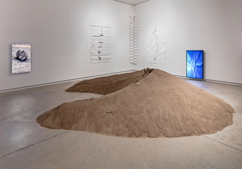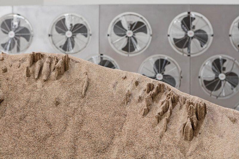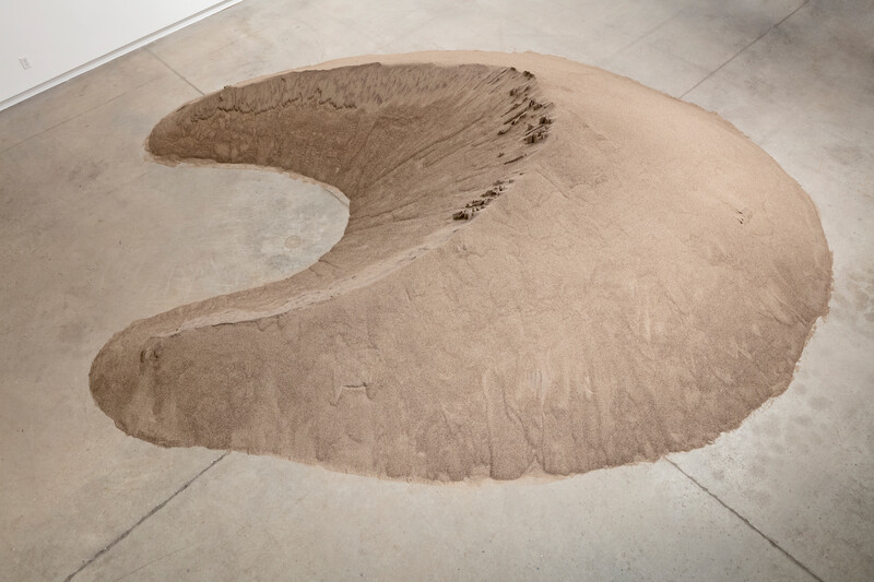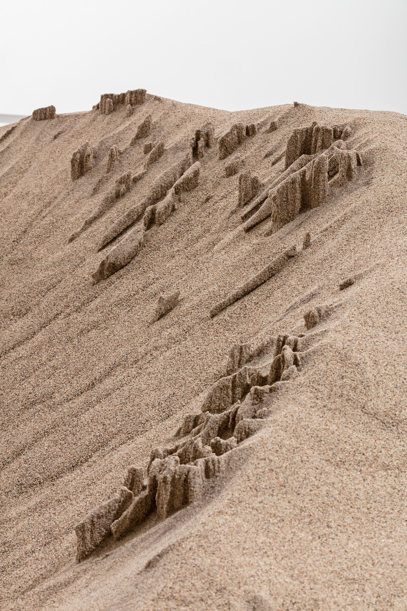 The shear physical execution and perfect replication of a dune at first distracts, but then leads to a state of contemplation. We find ourselves involved in the minute granular relationships, the slip face, pointy peaks, and seductive patterns. We marvel at how the grains get along so well, how they move together, and how they miraculously find each other after being blown about. But then we wonder, how did the sand get here? Where did it come from? And here is where a critical relation to the nature of the sand itself emerges. traction points to how technology has made incursions on—and wholly transformed—the natural.