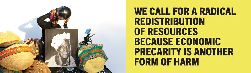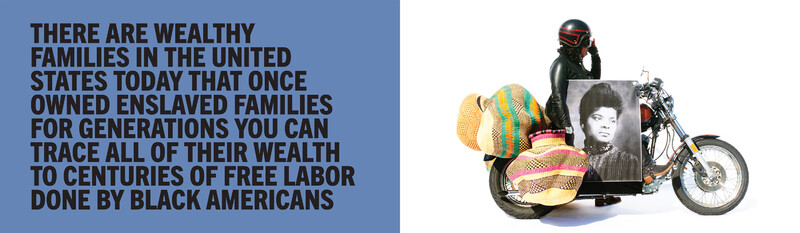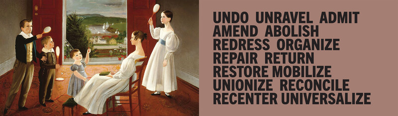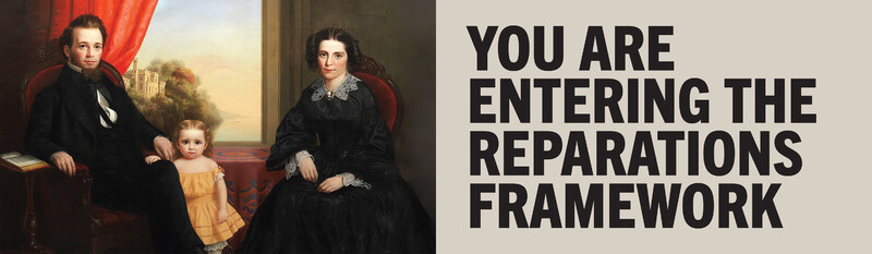 Xaviera Simmons’ image series Because You Know Ultimately We Will Band A Militia forms a patchwork of Black resistance and resurgence. With images that signify white antebellum wealth (parlour rooms, fancy dress, and expansive vistas) set alongside polemical, factual, and wry statements reflecting on slavery, settler colonialism, reparations, and systemic racism, Simmons’ work traces the centuries-old unpayable debts that underpin American life.