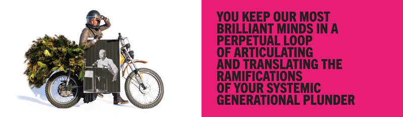 Like the handheld mirrors raised aloft in The Children of Nathan Starr11These are in fact badminton rackets., Simmons’ work refracts the many dynamics of race, gender, class, and power that suffuse cultural contexts throughout North America. Installed on monumental billboards in Cahuilla Territory, Palm Springs, California for Desert X 2021, Because You Know […] sites racial and colonial reckoning in the car-centric desert landscapes of the southwest. In a region deeply shaped by automobility, tourism, nuclear testing, militarism, water scarcity, tribal sovereignty, and the securitization of the US-Mexico border, Simmons’ images call attention to interrelated and intergenerational politics. They stop traffic: the steady flow of American capitalism becomes intractable amid all-caps demands for representation and repair.