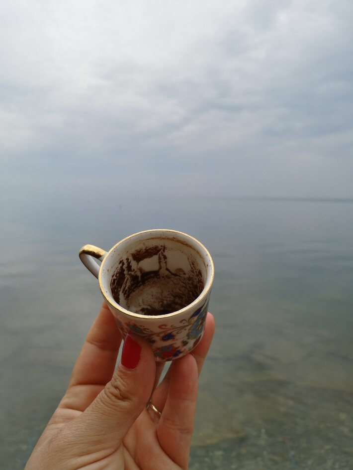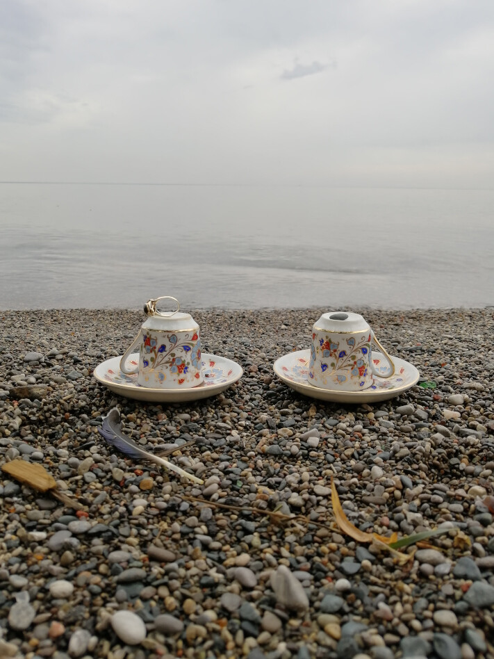 For the Waters imagines sharing a cup of coffee with the shoreline of Niigani-gichigami (Lake Ontario). Extending a gesture of care to the waters in the form of a Turkish coffee reading for the future. Drawing on symbolic meanings passed down to me through familial lines, the cup speaks to past, present, and future. Reading for, and from, the shoreline, is to read from the place where sky and water and earth meet. Shifts in the shoreline are indicators of larger forces. Reading from this place of relationship between elements, I necessarily consider my own situated relationship to them. To read coffee grounds is to acknowledge the beingness/aliveness/personhood of these elementals, our interlinked relationships with, and responsibilities to them. It is also a gesture of hospitality I only extend to those I wish to build intimacy with, so it is a gesture of love and care—an invitation to closeness.