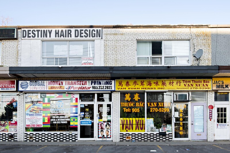 Sites of global money transfer services are indicated by the flags seen on the left. While flags are at home amid the bright colours of commercial signage, they also indicate the international scope of familial connections in Cooksville. Money links homelands here and abroad; it moves transnationally, changing shape along the way through currency exchange.