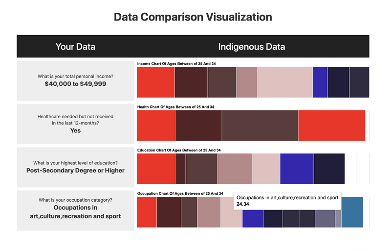 They are. We are. I am. prompts the visitor to offer their own data points, which are later compared to data points pulled from the Aboriginal People Survey (APS) for First Nations people living off-reserve, Métis, and Inuit living in Canada. The team and I chose to request data in the following areas: age, education level, occupation, and health access. These categories of data display the most disparate inconsistencies between the visitor and the extracted APS data. It is important to note that the visitor here is used to describe the average patron of contemporary art. However, we acknowledge that there would be folks of different ages and backgrounds and wanted to provide an experience with the most variety of output. With that said, for Indigenous peoples exploring the data visualization, it was geared toward solidarity and resource sharing. It is important not to collapse the different identities of patrons visiting the work. We wanted to display dissonance within the data. The most obvious data point to exhibit disproportion was health care, followed by total personal income, and level of degree achieved.