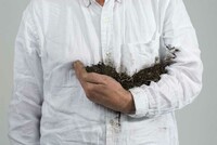 Weinberger’s hold acknowledges the complex histories tied to one’s family and birthplace. His hold is inflected by race and gender: We don’t often see white men photographed as caring or tender. But his hold doesn’t invert this relationship—it complicates it. A hold is an em/brace: sometimes tender, sometimes forceful. Weinberger’s hold is both, and the earth held in the crook of his arm mediates legacies of capitalism and colonialism. The gesture of care shown here is a messy one, enmeshed in how soil bespeaks environmental violence: compacted soils need enrichment; toxified soils need remediation; stolen soils need rematriation.