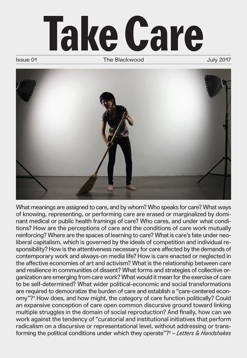 What meanings are assigned to care, and by whom? Who speaks for care? What ways of knowing, representing, or performing care are erased or marginalized by dominant medical or public health framings of care? Who cares, and under what conditions? How are the perceptions of care and the conditions of care work mutually reinforcing? Where are the spaces of learning to care? What is care’s fate under neoliberal capitalism, which is governed by the ideals of competition and individual responsibility? How is the attentiveness necessary for care affected by the demands of contemporary work and always-on media life? How is care enacted or neglected in the affective economies of art and activism? What is the relationship between care and resilience in communities of dissent? What forms and strategies of collective organization are emerging from care work? What would it mean for the exercise of care to be self-determined? What wider political-economic and social transformations are required to to democratize the burden of care and establish a “care-centered economy”?11Ina Praetorius, The Care-Centered Economy: Rediscovering What Has Been Taken for Granted, Heinrich Böll Foundation, Publication Series Economy + Social Issues 16 (2015): https://www.boell.de/sites/default/files/the_care-centered_economy.pdf. How does, and how might, the category of care function politically? Could an expansive conception of care open common discursive ground toward linking multiple struggles in the domain of social reproduction? And finally, how can we work against the tendency of “curatorial and institutional initiatives that perform radicalism on a discursive or representational level, without addressing or transforming the political conditions under which they operate”?22Helena Reckitt, “Support Acts: Curating, Caring and Social Reproduction,” Journal of Curatorial Studies 5, no. 1 (2016): 25. Here, Reckitt draws on Marion von Osten and Andrea Phillips, among others.